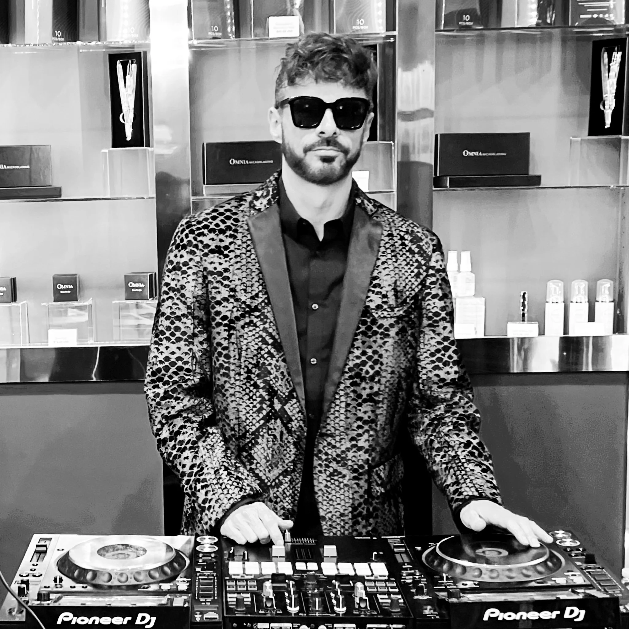 A man with a beard and sunglasses standing behind a Pioneer DJ turntable in a store display. He is wearing a patterned blazer and a black shirt, with his hands resting on the equipment.