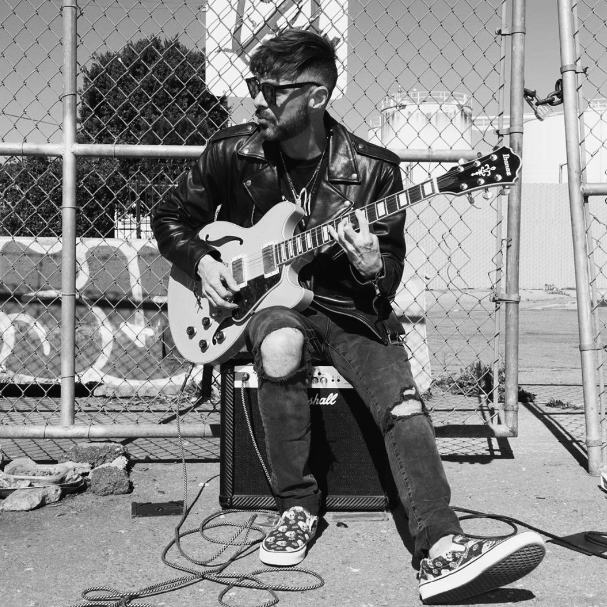Man playing electric guitar outdoors, sitting on an amplifier in front of a chain-link fence, wearing sunglasses, leather jacket, ripped jeans, and patterned sneakers, black-and-white photo.