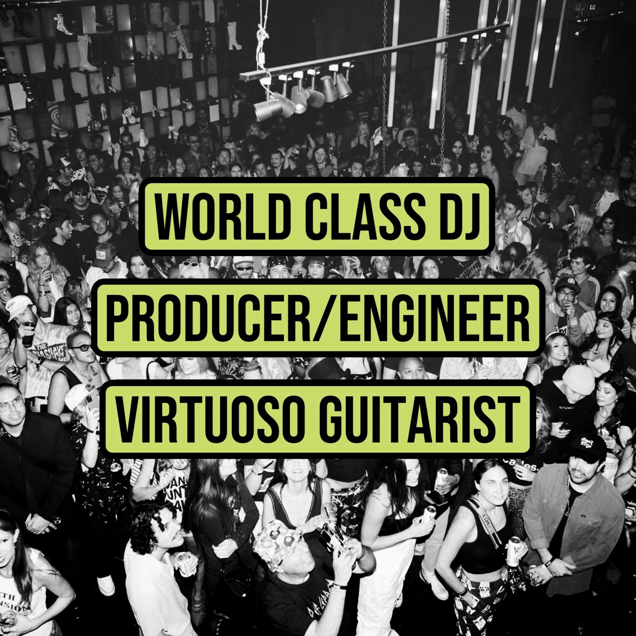Crowd of people at a concert or event, with text overlay saying 'World Class DJ Producer/Engineer Virtuoso Guitarist'.